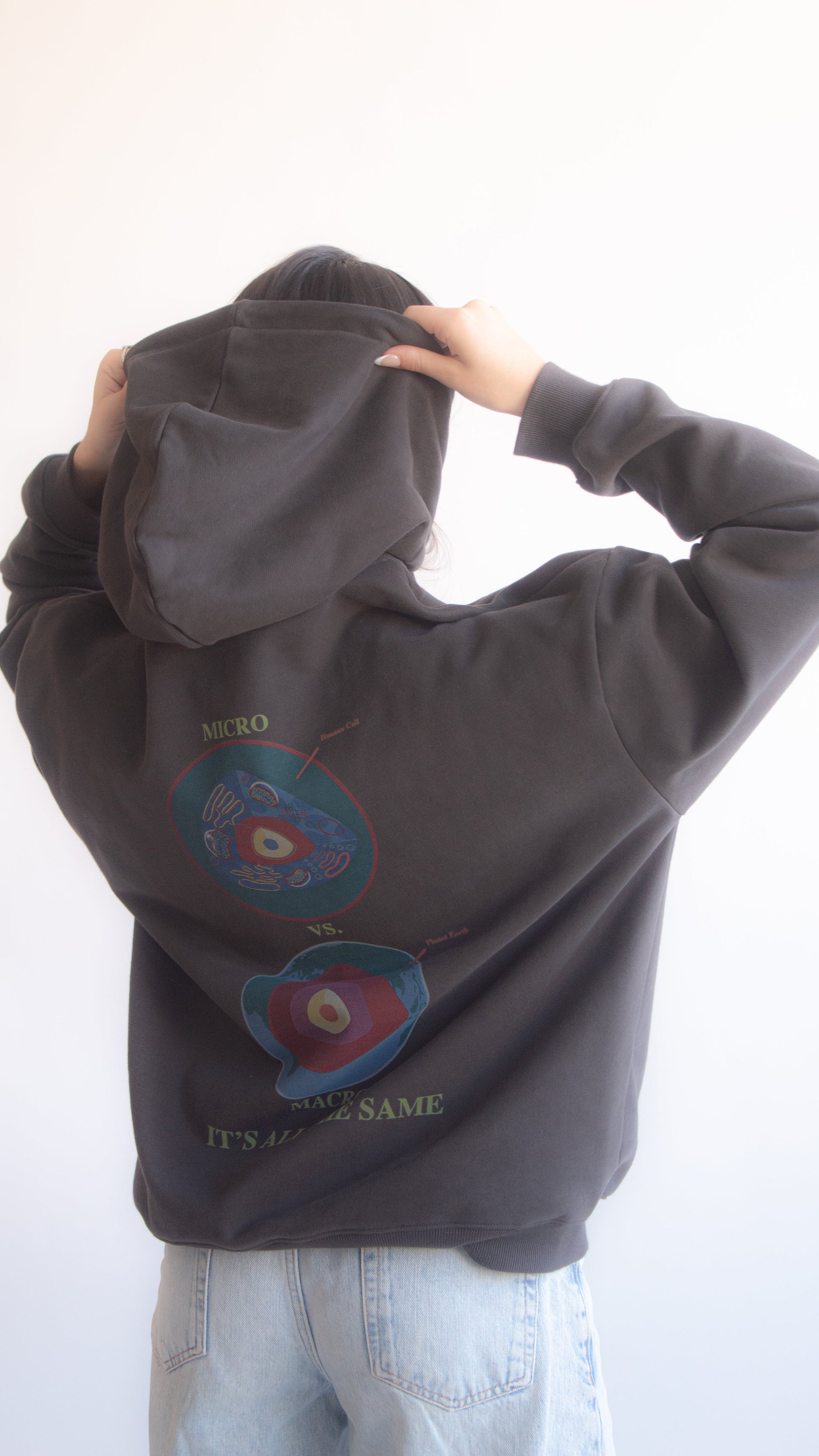 - Drop shoulder, slight crop, elongated sleeves, roomy hood
